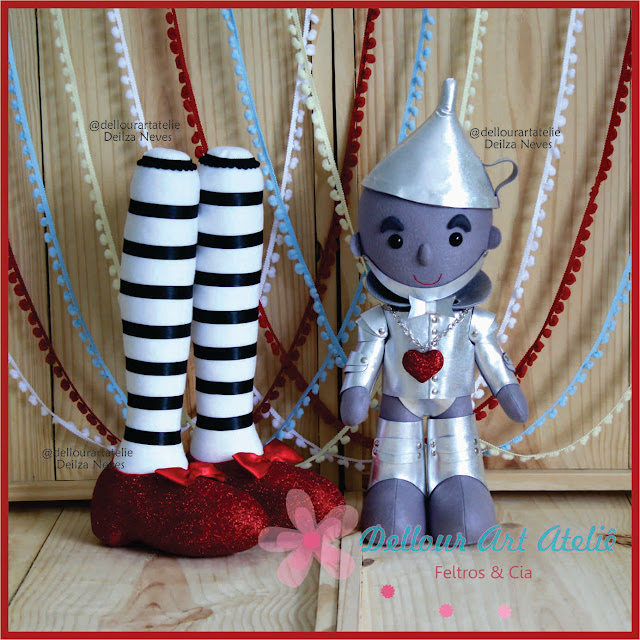 Ele tem cerca de 53 cm de altura, corpo em feltro e toda a parte em lamê luminoso é dublada com feltro usando termocolante importado. O coração em feltro com aplicação de cola com glitter.